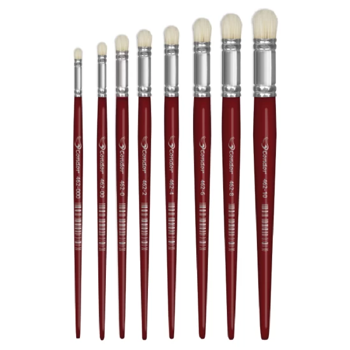 Redondo: os pelos longos, arranjados de forma compacta, deste tipo de pincel permitem reter mais tinta que outros pincéis de mesmo tamanho, mas formato diferente. Por isso, muitos artistas preferem-no ao colorir grandes áreas.